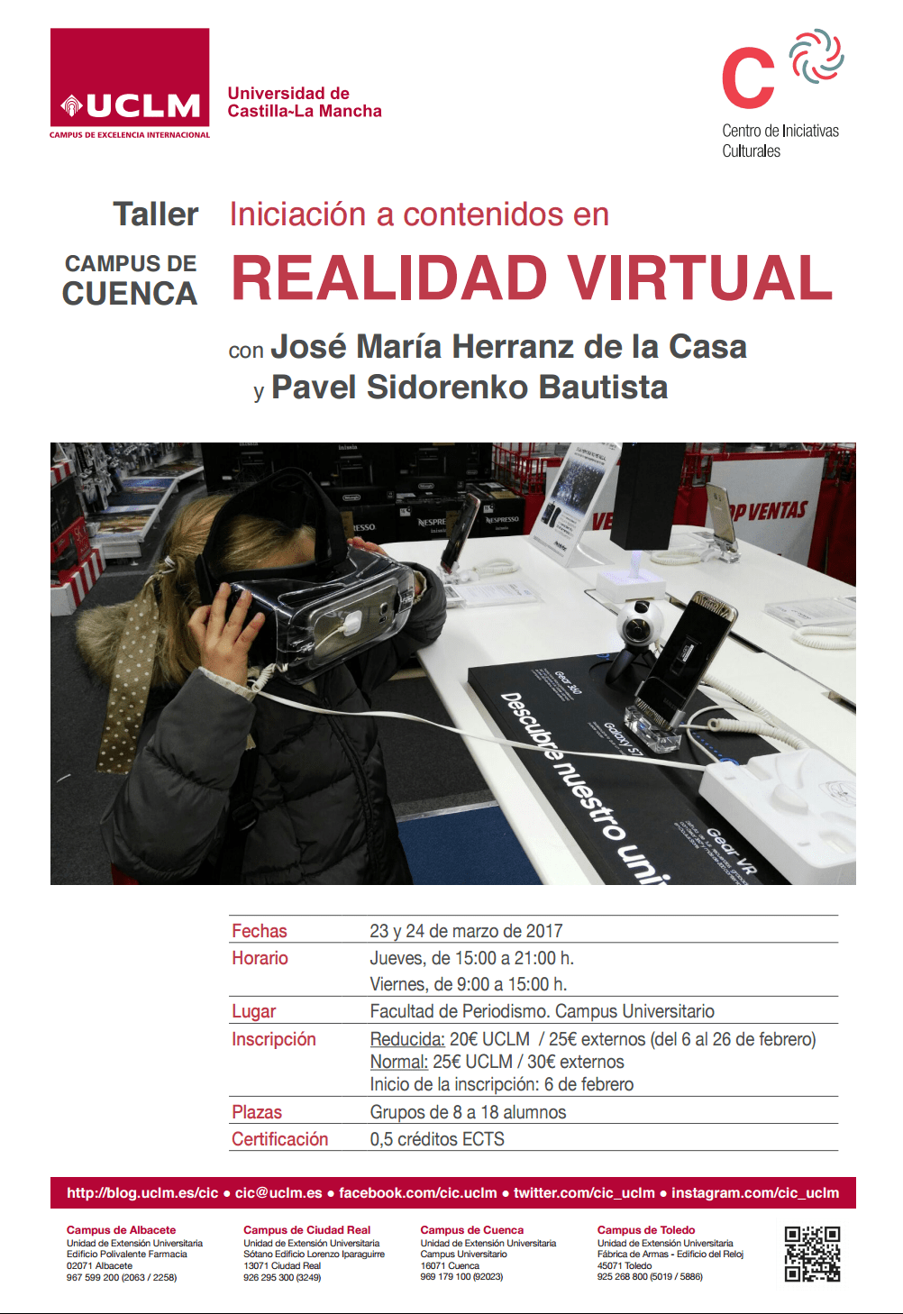 Aula con acceso wifi para los alumnos del curso. Los profesores proporcionarán gafas adaptadas (Google Cardboard) para vivir la experiencia de realidad virtual. Se recomienda que los alumnos traigan sus cargadores de móviles.