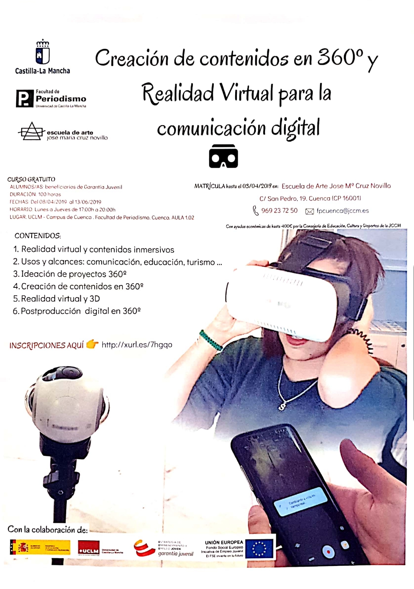 La Junta de Comunidades de Castilla-La Mancha, con la colaboración de la Universidad de Castilla-La Mancha ofrece un curso de formación profesional de 100 horas, certificado, para la creación de contenidos multimedia en 360º y realidad virtual en la ciudad de Cuenca. Hay oportunidad de formalizar la inscripción online hasta el 3 de abril.