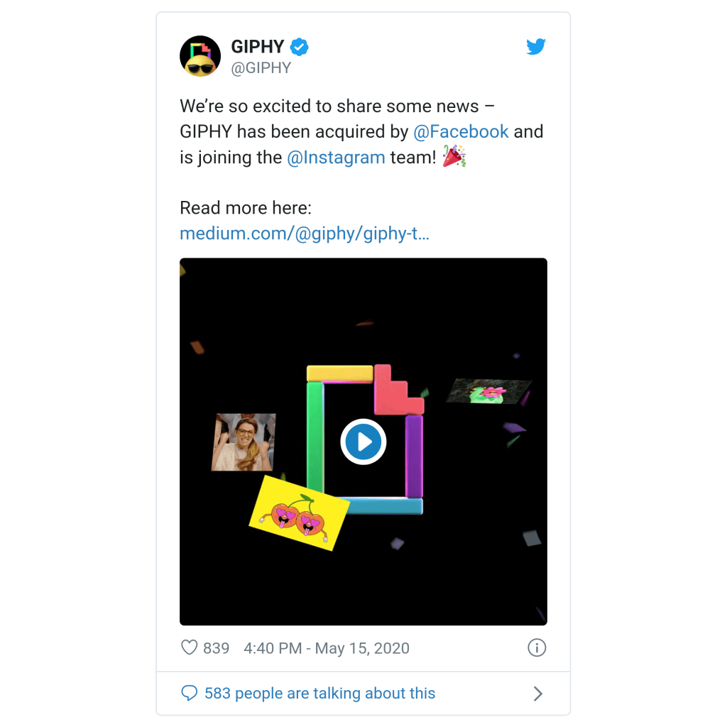 Como última jugada, el popular reprositorio de GIF ‘Giphy’ anunció su venta a Facebook, para formar parte exclusiva de Instagram. Una movida empresarial importante tomando en cuenta que Giphy prestaba servicio a trvés del teclado Gboard de Google, así como permitía integrar GIF a diferentes plataformas sociales.