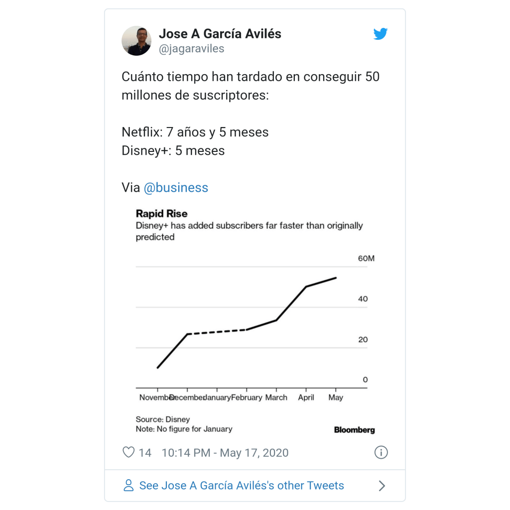 El profesor García Avilés de la Universidad Miguel Hernández, destacó cifras de Bloomberg donde se muestra que mientras Netflix tardó casi 7 años y medio en alcanzar 50 millones de usuarios, Disney+ alcanzó una audiencia similar en apenas 5 meses.