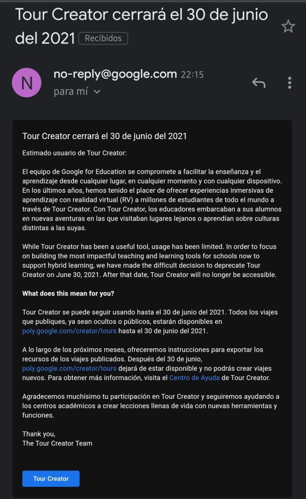 Por lo tanto, el tutorial de la entrada 👉 https://pavelsidorenko.wordpress.com/2018/09/24/tutorial-para-creacion-de-tours-virtuales-con-google-vr-tour-creator-y-google-camera-cardboard/, cuyo vídeo casi ha llegado a 10 mil visualizaciones en YouTube, las cuales agradezco por la confianza que ustedes me han otorgado, queda sin efectos a mediados de dicho año.