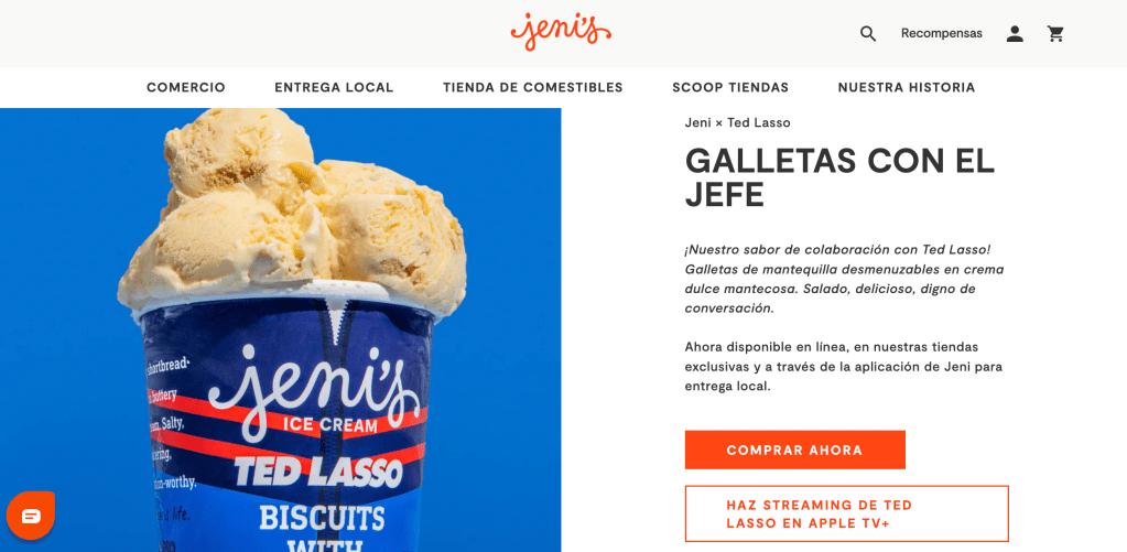 Y es que los productos relacionados o con licencia oficial también forman parte de la dimensión transmedia, cuando un fenómeno empieza a escalar a diferentes públicos. Así, no solamente Ted Lasso tiene la oportunidad de pervivir con indumentaria relacionada o en el mundo de los videojuegos. Los establecimientos estadounidenses Jeni’s han ofrecido por tiempo limitado un helado que procura una experiencia complementaria y que sí, también constituye en sí misma una estrategia de marketing.