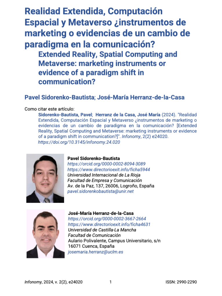 La rápida evolución tecnológica está impulsando la virtualización en diversos cam-pos, formando comunidades digitales específicas y estableciendo las bases para el metaverso. Los avances en tecnologías móviles, big data e inteligencia artificial es-tán reconfigurando en muchos sentidos la vida humana. Se trata de un escenario que carece de uniformidad y que está determinado por las necesidades de los prin-cipales actores tecnológicos. Con la aparición de nuevas tecnologías y evolución de las existentes, se redefinen constantemente conceptos como el de RealidadVirtual, Realidad Aumentada y Realidad Mixta, originando otros como el de la Realidad Ex-tendida y conviviendo en el mismo espacio tiempo con propuestas como el Meta-verso y ahora más recientemente, la Computación Espacial. Esto genera preguntas sobre la conveniencia o utilidad real de estos, sus principales diferencias y conside-raciones principales, lo cual exige un mayor compromiso en torno a la alfabetización digital.