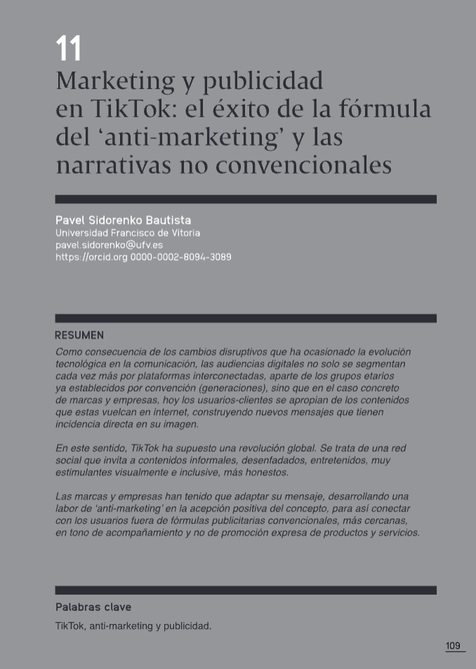 Como consecuencia de los cambios disruptivos que ha ocasionado la evolución tecnológica en la comunicación, las audiencias digitales no solo se segmentan cada vez más por plataformas interconectadas, aparte delos grupos etarios ya establecidos por convención (generaciones), sino que en el caso concreto de marcas y empresas, hoy los usuarios-clientes se apropian de los contenidos que estas vuelcan en internet, construyendo nuevos mensajes que tienen incidencia directa en su imagen. En este sentido, TikTok ha supuesto una revolución digital. Se trata de una red social que invita a contenidos informales, desenfadados, entretenidos, muy estimulantes visualmente e incluso, más honestos. Las marcas y empresas han tenido que adaptar su mensaje, desarrollando una labor de ‘anti-marketing’ en la acepción positiva del concepto, para así conectar con los usuarios fuera de fórmulas publicitarias convencionales, más cercanas, en tono de acompañamiento y no de promoción expresa de productos y servicios.